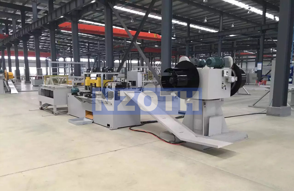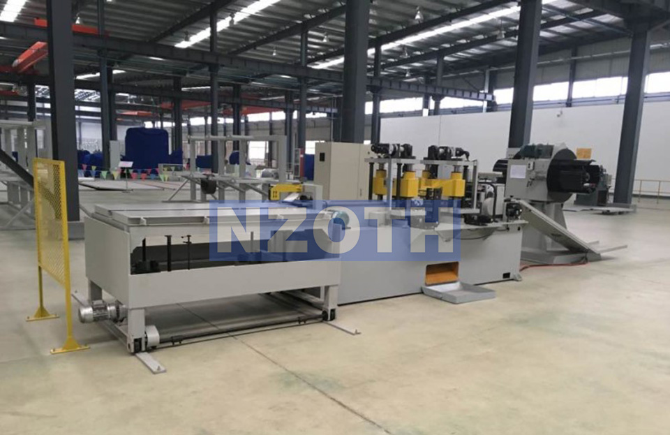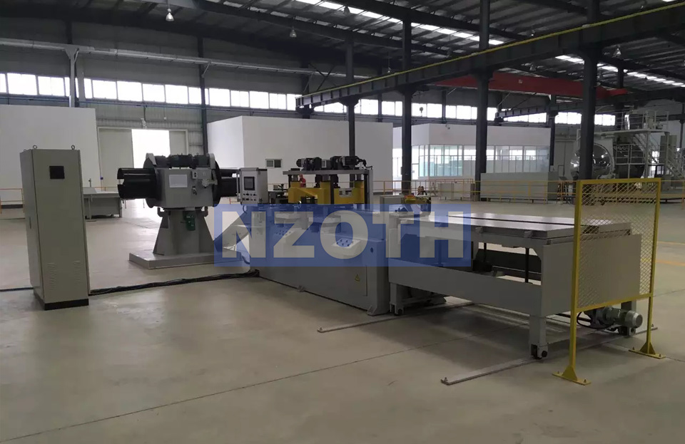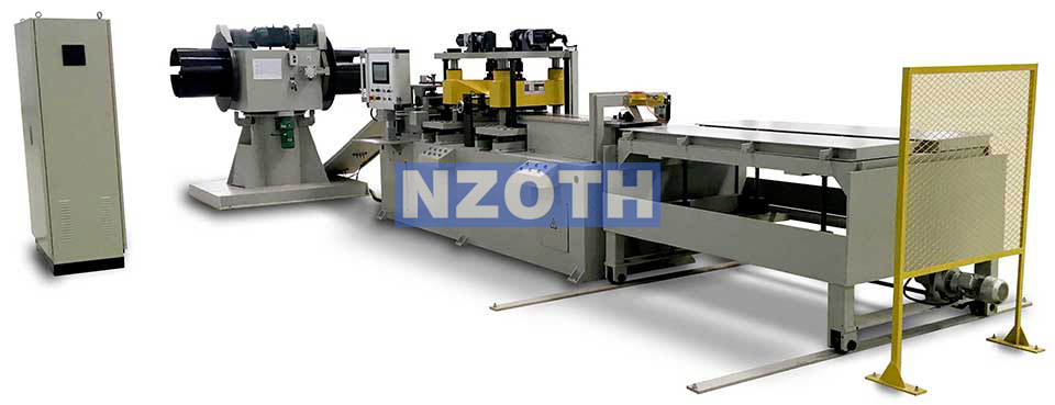 本設備由雙軸開料機,編碼器,送料裝置,滾珠螺桿導向裝置,一臺沖孔機,二臺V沖剪切裝置,料片傳送裝置,承料臺,電源系統(tǒng)等組成。